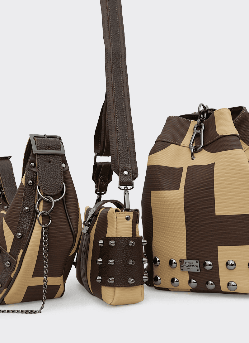Signature και προσωπικά αγαπημένο item της σχεδιάστριας. Μία τσάντα που μετατρέπεται πολύ εύκολα από πρωινή σε βραδινή αφαιρώντας τον υφασμάτινο ιμάντα, ενώ τα πλαϊνά τρουκς της δίνουν πιο edgy style. Κατασκευασμένο από Vegan δέρμα, διαθέτει χώρο για τα απαραίτητα της μέρας ή της βραδιάς. Κλείνει με φερμουάρ, εσωτερικά επενδυμένη με αδιάβροχη φόδρα, με μία εσωτερική τσέπη με φερμουάρ και θήκακι για κέρματα ή κινητό. Με ευκολία θα το κατατάσσαμε στα top five προϊόντα της εταιρείας.